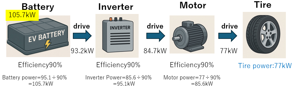 =タイヤ出力(kW)×モータ効率(%)×インバータ効率(%)×バッテリー効率(%)