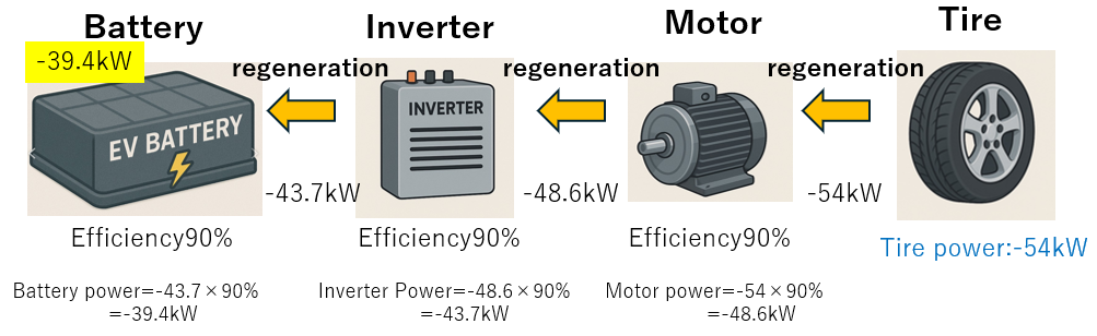 次は回生時のエネルギーの流れを考えます。回生時はエネルギーの向きが逆になるので、タイヤで回収した減速方向のタイヤ出力はモータ・インバータ・バッテリーと伝達される中で、それぞれのコンポーネントでロスが発生し、最終的に残った電力がバッテリーに充電されることになります。式にすると以下の通りです。