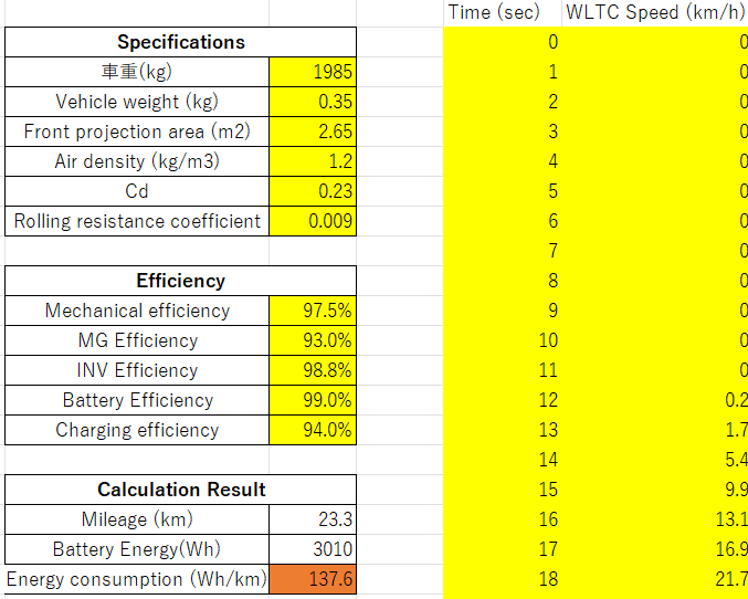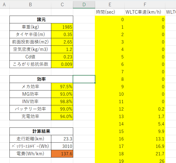 他の諸元で電費計算をしてみたい方は、黄色のセルをいじってみてください。今回は電費走行モードの時間が1800sec(WLTC)ですが、走行モードの時間が変わる場合はセル参照など修正が必要です。